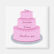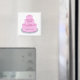 A pintura de um bolo cor-de-rosa de três pontas, decorado com rosas claro e guarnições cor-de-rosa escuro, sobre uma bandeja prateada, com espaços reservados para o seu texto, é impressa em Imã salve o dia. O texto é fácil de personalizar e coordena com o bolo.