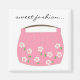 Uma bolsa floral cor-de-rosa com um punho de madeira e flores brancas com centros coloridos. Um ditado divertido para a moda consciente!