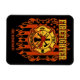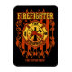Com um crachá de bombeiros no centro com hidrante, capacete, gancho e escada. Grande texto da FIREFIGHTER sobre um fundo da bandeira americana com fogo. Excelente de apoio a bombeiros, arrecadadores de fundos, reformados, tempo de cheio e bombeiros voluntários.