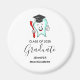Íman de graduação com uma ilustração de um estilo de desenho animado, grande dente branco sorrindo alegremente segurando uma escova de dente vermelha e dando aos polegares uma placa para cima. Vestindo um boné de formatura preto.
