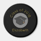 Um ímã que diz Classe 20xx e o nome do formando, escrito em cor dourada. Projetado com um boné de formatura preto cercado por um círculo branco semitransparente. O fundo preto com letras douradas é simples, mas na moda.