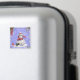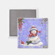 Bonito boneco de neve de Natal com chapéu vermelho, cachecol e algemas. Dois pequenos amigos de aves, ramos festivos e bagas. Tudo num floco de neve coberto de fundo azul - ímã quadrado