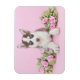 Um lindo filhote de rouco a brincar com rosas cor-de-rosa num fundo rosa.