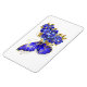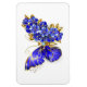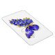 Borboleta de flores cinza, azul, safira, espumante com asa decorada com flores preciosos azuis com folhas de ouro sobre fundo branco.