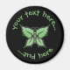 Ícone de borboleta composto por folhas verdes de menta. Cor de fundo personalizada. Dois campos de texto personalizados em círculo.