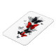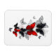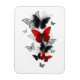 Bando de borboletas voadoras, realistas, vermelhas e pretas em fundo branco com gotas de tinta.