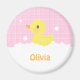 Um ímã personalizado para a garotinha! Vem com um pato de borracha amarelo giro em chá e sabão. Muitas bolhas de chá e um azulejo de banheiro rosa doce fundo de parede.