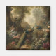 pintura botânica vintage de três pavões num jardim inglês cercado por flores pastel