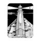 Uma ilustração a preto e branco do farol no final do banco de pedras em Nelson, Nova Zelândia. Este farol está no corte perto e tem a ilha de costa ao fundo.