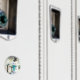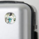 Um ímã com um desenho fofo com um boneco de neve vestindo um legal chapéu e cachecol. O fundo tem uma linha de pinheiros brancos cobertos de neve.