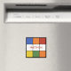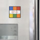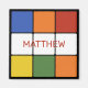 Este simples design geométrico de quadrado em cores primárias brilhantes de cor laranja, azul, vermelha, verde, amarela e branca contra fundo preto tem uma sensação retrógrada dos anos 80. Adicione seu próprio nome ou outro texto para criar sua própria imã de geladeira quadrada personalizada. Torna um excelente pequeno presente ou estocante.