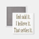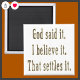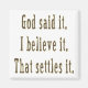 Letras castanhas leram, "Deus disse. Eu acredito. Isso resolve." Forte maneira de compartilhar sua fé em Deus e sua crença em sua religião. Um presente maravilhoso para Natal, Páscoa, aniversários ou qualquer época especial. Excelente, também para ocasiões religiosas como ordenações, casamentos, batismos, primeiros sindicatos, confirmações, e qualquer dia sagrado.