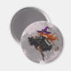 Uma poderosa ilustração de uma bruxa encantada, vestida com um sofisticado vestido preto, chapéu roxo e cabelos flamejantes esvoaçando como chamas sob o luar. Esta obra de arte combina misticismo, estilo e elegância, tornando-a perfeita para quem aprecia uma estética de Halloween elegante e marcante.