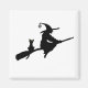 Um desenho de uma bruxa sobre uma vassoura com um gato preto também sentado na vassoura.