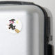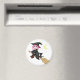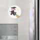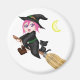 Uma bruxa de cabelos cor-de-rosa voando na vassoura com o gatinho!