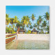 Esta foto mostra um barco estacionado em uma praia arenosa olhando para bungalows de resort na praia de Tawaiian.