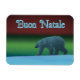 Um urso polar vagueia o gelo durante a longa noite polar; o Norte brilha em vermelho e verde à distância. O texto italiano que lê "Buon Natale" aparece em azul e branco brilhantes.