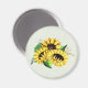 Magneta com um bonito buquê de flores com girassóis amarelos e folhas verdes animados. Fresco e divertido.