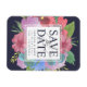 Anuncie seu casamento em estilo dramaticamente elegante com nossos imã salve o dia ricos e corajosos. Design apresenta um buquê de flores silvestres a aquarelas em um fundo azul-da-meia-noite temperado e profundo. Seus detalhes de casamento — nomes, data e local — são exibidos no centro em uma mistura moderna de blocos e tipos de escrita de caligrafia.