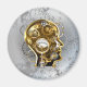 Cabeça conceitual, mecânica, humana com manômetro antigo e engrenagens metálicas contra fundo industrial das cinzas. Estilo Steampunk.