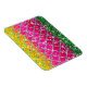 Apresentando trabalho de arte digital de brilhos em amarelo, rosa e verde com linhas cruzadas azul-brilho. O padrão se parece com cobras. Observe que esta é uma imagem digital, de modo que não há falhas reais no produto final.