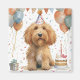 Ótima ilustração cartoon de Cães de Goldendoodle vestindo um chapéu de aniversário ao redor de um bolo de aniversário e balões. Perfeito para amantes de animais de estimação ou pais de cães.
