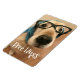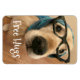 Este ímã mostra uma fotografia de um triste cão que recupera ouros em óculos de nerd pretos e lenço azul. O texto diz, "Abraços Grátis".