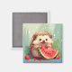 ilustração encantadora de um ouriço desfrutando um pedaço de melancia. O ouriço tem uma expressão feliz, com os olhos fechados em deleite, e está cercado por alguns morangos e folhas. O estilo de desenho de tinta adiciona um toque brilhante e fofo à cena.