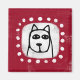 Um cachorro desenhado bonito em preto e branco sobre um fundo texturizado vermelho cercado de pontos brancos.