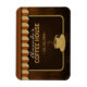 Compro de café © Sunny Mars Designs. Este ímã flexível, legal, moderno, na moda, marrom-tendão e bege personalizado apresenta uma ilustração de uma xícara de vapor de café preto, em uma xícara de café de porcelana-creme ou caneca com algumas aparências de café listradas, uma janela ou um cartaz e alguns grãos de café sutis no fundo. Personalize ou personalize-o adicionando seu próprio nome, nome comercial e texto.