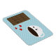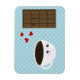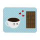 Uma xícara de café kawaii e bar de chocolate, olhem bem um para o outro, com três corações vermelhos flutuando entre eles. O fundo é azul claro com bolinhas.