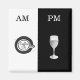 Dividido em duas partes iguais pela manhã e pela noite. Branca do lado da manhã com ilustrações em preto e script personalizado e preto do lado da noite com ilustrações brancas e script personalizado.