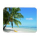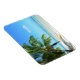 Imagem retangular de souvenir com um caiaque amarelo sob uma palmeira pendurada numa praia de areia branca na ilha tropical de Moorea, perto de Tahiti, no arquipélago pacífico Polinésia Francesa.