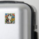 A cute calico cat standing in red poppies, blue iris and yellow sunflowers done n a pretty folk art style.