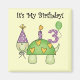 Uma tartaruga verde sorridente vestindo uma festa que carregar uma vela de aniversário nas costas e escreve no texto "É Meu Aniversário". Um balão de hélio carregar o número 3!