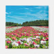 Filas e filas de papoilas vermelhas e brancas em um dia brilhante de verão com céus azuis.