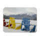 COPYRIGHT Cindy Miller Hopkins / DanitaDelimont.com | CN01 CMI0065.jpg | Canadá, Alberta, Jasper, Jasper NP. Fairmont Jasper Park Lodge. Cadeiras coloridas ao redor do lago congelado, Lac Beauvert.