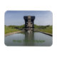 Vista ensolarada do Canal du Center em Le Roeulx, Hainaut, Valônia, Bélgica. O elevador de barco Strépy-Thieu/L'ascenseur funiculaire de Strépy-Thieu é visível no centro da imagem rodeada por uma paisagem de colinas cuidadosamente curvas no fundo. O marco industrial se reflete na simetria e equilíbrio da água que cria a foto. Imagem de excelente souvenir desta parte fascinante da Bélgica.