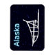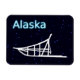 Uma silhueta branca de um trenó sobre fundo estelar. "Alaska" aparece em azul e branco brilhantes.