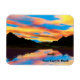 Uma canoa atravessando um lago de montanha refletindo as belas laranjas e blues de um pôr do sol colorido. Adicione seu próprio texto.