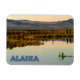Sozinho na natureza. Uma canoa joga água espelhada do lago no interior do Alasca. Na distância típica de taiga e montanhas. A leitura de texto "Alaska" também é exibida. Esta imagem é derivada de uma fotografia do Serviço de Pesca e Vida Selvagem dos Estados Unidos.