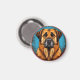 Cão pastor da Anatólia com um casaco grosso dourado-marrom, olhos grandes expressivos e um rosto distintamente moldado. O fundo é um azul vibrante, enquadrado por uma borda decorativa circular.