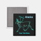 Uma renderização brilhante, semelhante a neon, de uma rena (Rangifer tarandus), também conhecida como rena. Leitura de texto, "Alaska" aparece em azul e branco brilhantes. Personalize adicionando seu próprio texto adicional. Inspirado pelas luzes do Norte.