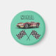 Um carro de corrida desportivo com bandeiras marcadas abaixo num pano de fundo verde onde no topo é onde você pode personalizá-lo com um fazer de nome único e seu. Esportes divertidos vibram.