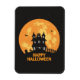 Uma casa assombrada com uma lua de cheio e texto "Feliz Dia das Bruxas".