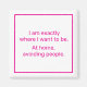 Este ímã é uma vibração. Use-o para declarar sua preferência por uma solidão pacífica. O texto rosa-quente diz, "Estou exatamente onde quero estar. Em casa, evitando pessoas." Outras cores disponíveis incluem azul escuro, vermelho escuro, preto e verde escuro.