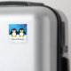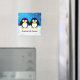 Dois adoráveis pinguins preto e branco de mãos dadas em um dia de inverno nevado. Um modelo abaixo dos pinguins para adicionar seus nomes.