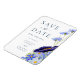 Bonita mão elegante pintou primavera de aquarela e flores de verão, incluindo flores silvestres em azul marinho, azul de córnflor, roxo, verde e amarelo, casamento salvar o ímã de datas. O primavera único pintado à mão e o trabalho de arte de flores de verão incluem cosmos, flores de milho, papoilas e me esqueçam de nãos com folhagem. Modelo fácil de usar com moderno e elegante roteiro de tipografia. Perfeito para um único casamento floral azul botânico temido no verão ou na primavera. Arte original de Catherine Sweetman. Encontre itens correspondentes na elegante suíte de casamento floral azul de verão