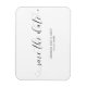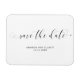 Uma Imã salve a data tipográfica com caligrafia preta com baloiços e corações sobre fundo branco. O layout simples e mínimo e muito espaço aberto dão a esta design um toque moderno e a letra caligráfica e os corações lhe dão uma reviravolta romântica.