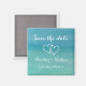 Casamento com aqua azul-aqua salve os ímãs da data. Elegante design de pintura a cores da água com modelo de tipografia de script e dois corações interligados. O destino da praia tropical Classy DIY para noiva e casal de noiva. Fornecimentos de partes descartáveis para recepções de casamento bonito ao ar livre, hora do coquetel costeiro, CHURRASCO de noivado costeiro, chá de panela oceânico, aniversário da frente d'água, etc. Duplo coração interpreso. Parte de um conjunto de coleção correspondente com convites elegantes, imã salve o dia, cartas de agradecimento, artigos de papelaria e outros acessórios decorativos para um lugar perfeito para casamento. Decoração personalizada com nomes personalizados e data. Altere a quantidade para obter o preço em massa barato.